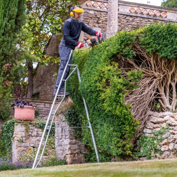 Henchman Platform Tripod Ladder - 1 Adjustable leg 10ft One adjustable leg for level and stable steps on moderately uneven or sloping terrain. Uniquely, all Henchman Tripods include the 7" deep "Platform" rung for safety and comfort Tuck your legs in, gain added support against your thighs, without hitting shins on rung above Top rail for one-handed support whilst working; or for leaning against whilst using both hands Wide, clawed feet are designed to "grab" soft ground and so prevent slipping or sudden sinking The 3-leg 'milking stool' principle makes it impossible to wobble and extremely difficult to topple Narrow top and third leg for access to tight awkwaard spaces. Incredibly light for ease of carriage and storage Rubber'shoes' can be purchased for added grip and no scratching inside or on hard slippery surfaces Available in 6' to 16' sizes - unique to Henchman