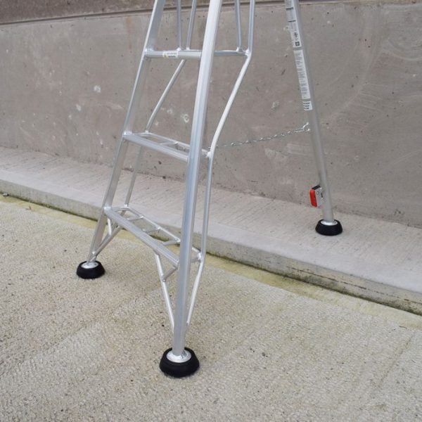 Henchman Platform Tripod Ladder - 1 Adjustable leg 8ft One adjustable leg for level and stable steps on moderately uneven or sloping terrain. Uniquely, all Henchman Tripods include the 7" deep "Platform" rung for safety and comfort Tuck your legs in, gain added support against your thighs, without hitting shins on rung above Top rail for one-handed support whilst working; or for leaning against whilst using both hands Wide, clawed feet are designed to "grab" soft ground and so prevent slipping or sudden sinking The 3-leg 'milking stool' principle makes it impossible to wobble and extremely difficult to topple Narrow top and third leg for access to tight awkwaard spaces. Incredibly light for ease of carriage and storage Rubber'shoes' can be purchased for added grip and no scratching inside or on hard slippery surfaces Available in 6' to 16' sizes - unique to Henchman