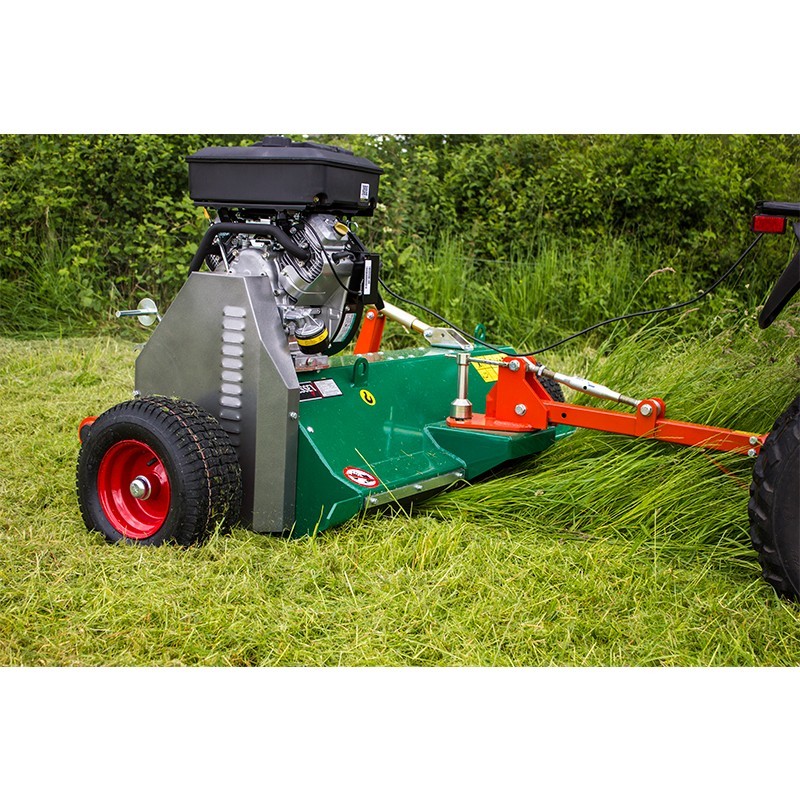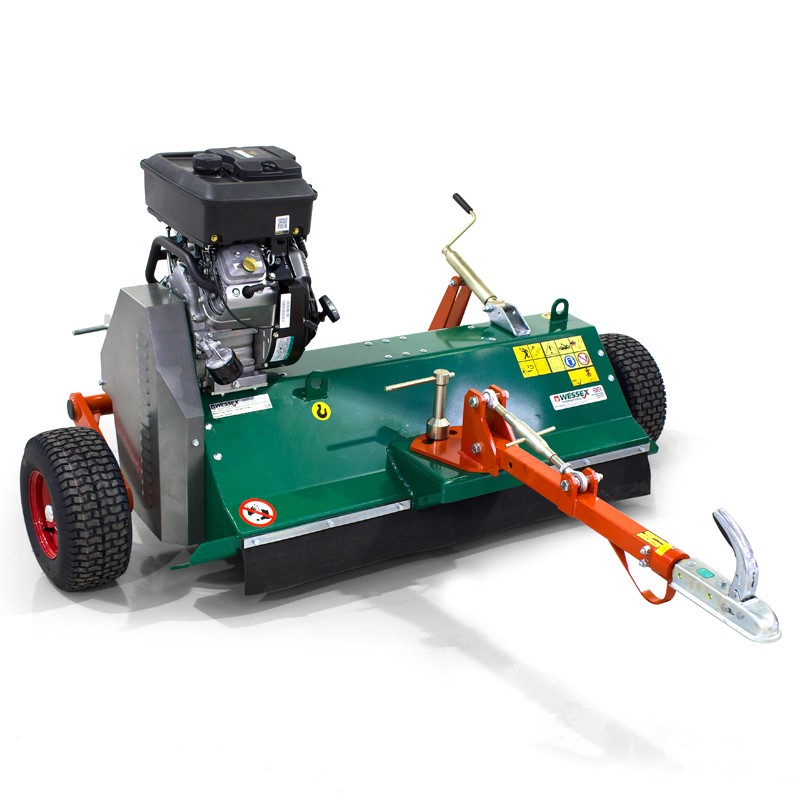 Key features - High quality flail mowers designed for use with ATV's and UTV's AFC series feature a centrally mounted engine as opposed to the AF side mounted engine Available in sizes 1.2m, 1.5m and 1.6m working widths Four variants of wheel configuration Positive manual drive engagement for high performance and long-life Three Z-section drive belts for maximum cutting power - Drive is transmitted to the rotor via 3 high performance Z section belts, and a manual clutch. In rough work and dense material, this system is more efficient than a centrifugal clutch & allows the mower to cope with more demanding conditions 5mm steel plate deck for durability & strength Remote engine stop switch - to comply with H&S regulations all Wessex AF & AFC mowers are fitted with a remote engine kill switch. This ensures that the mower engine can be stopped instantly without the operator needing to leave his seat. Cutting height range of between 10mm - 160mm Heavy duty Y-pattern flails mulch material, before evenly distributing debris across the full width of the machine Simple screw-handle cutting height adjustment - by a simple screw handle mechanism at the rear which alters the position of the wheels, whilst a turnbuckle on the drawbar levels the machine at the desired cutting height. Adjustable drawbar to allow mower to be offset for cutting to one side of ATV, this is particularly useful when mowing to an edge. Swivelling ball hitch for increased safety this is a standard fitment. This is a legal requirement of the HSE. Anti-scalp roller - The full width adjustable anti-scalp roller takes the weight of the machines to eliminate scalping, should a wheel drop into a rut.